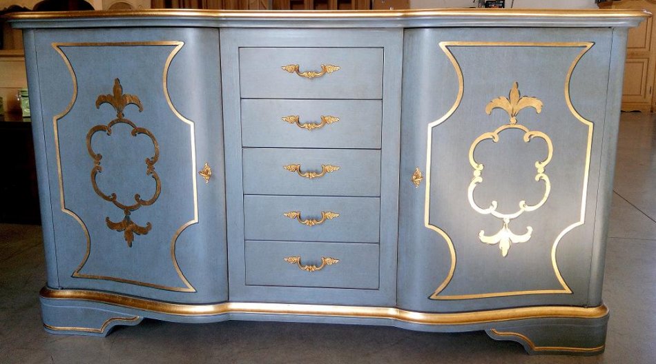 Credenza laccata 2 porte e 5 cassetti (blu/oro)