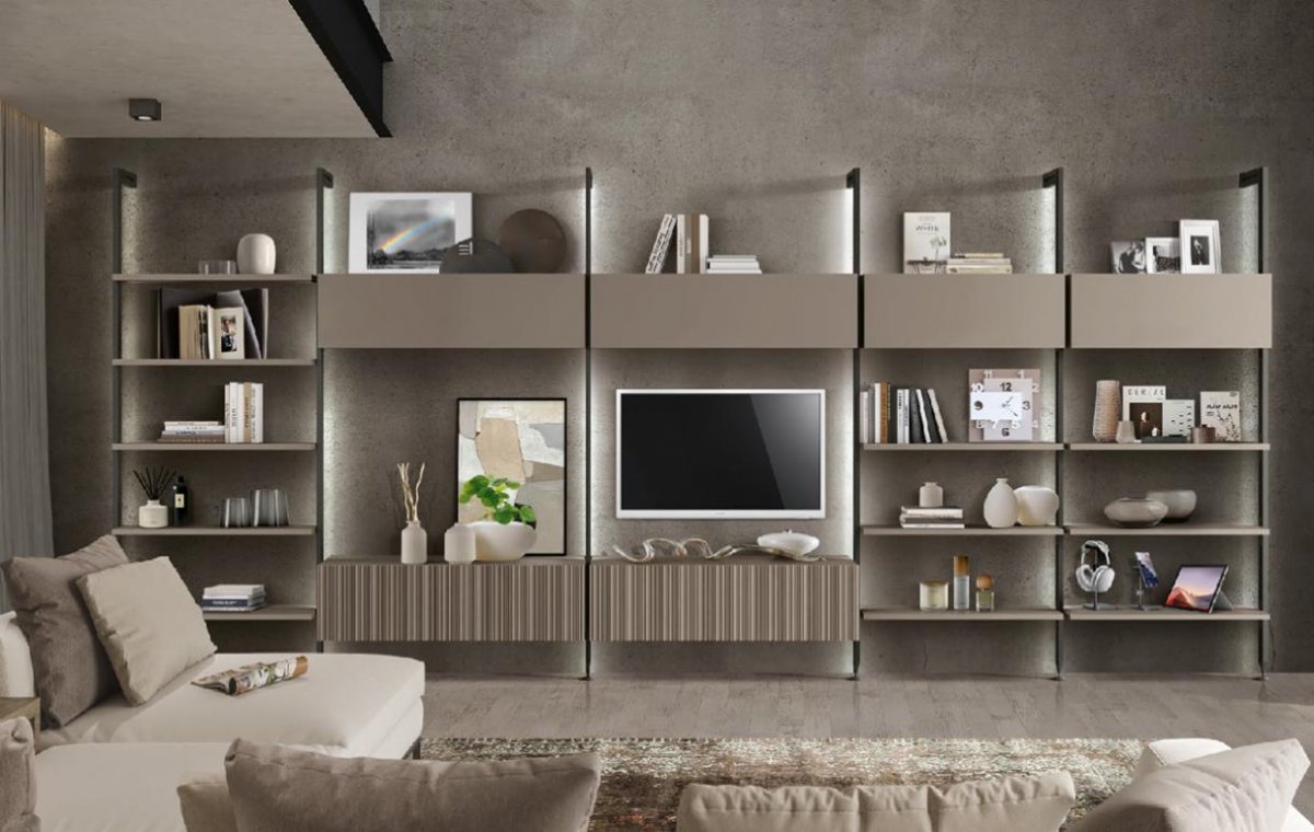 Parete Murano componibile in frassino montanti in metallo